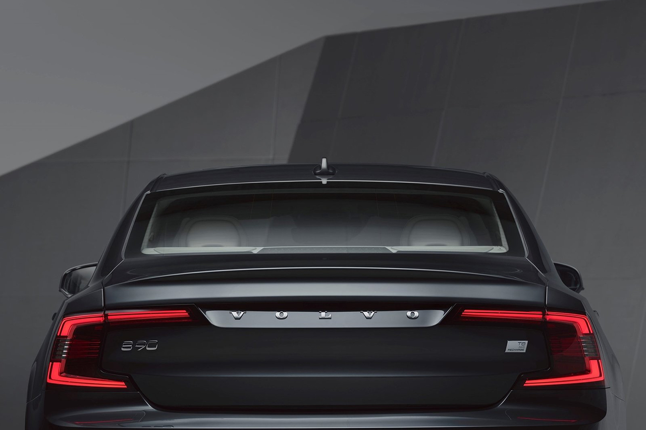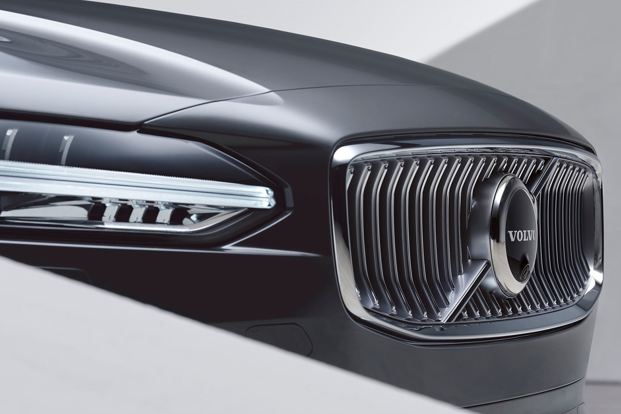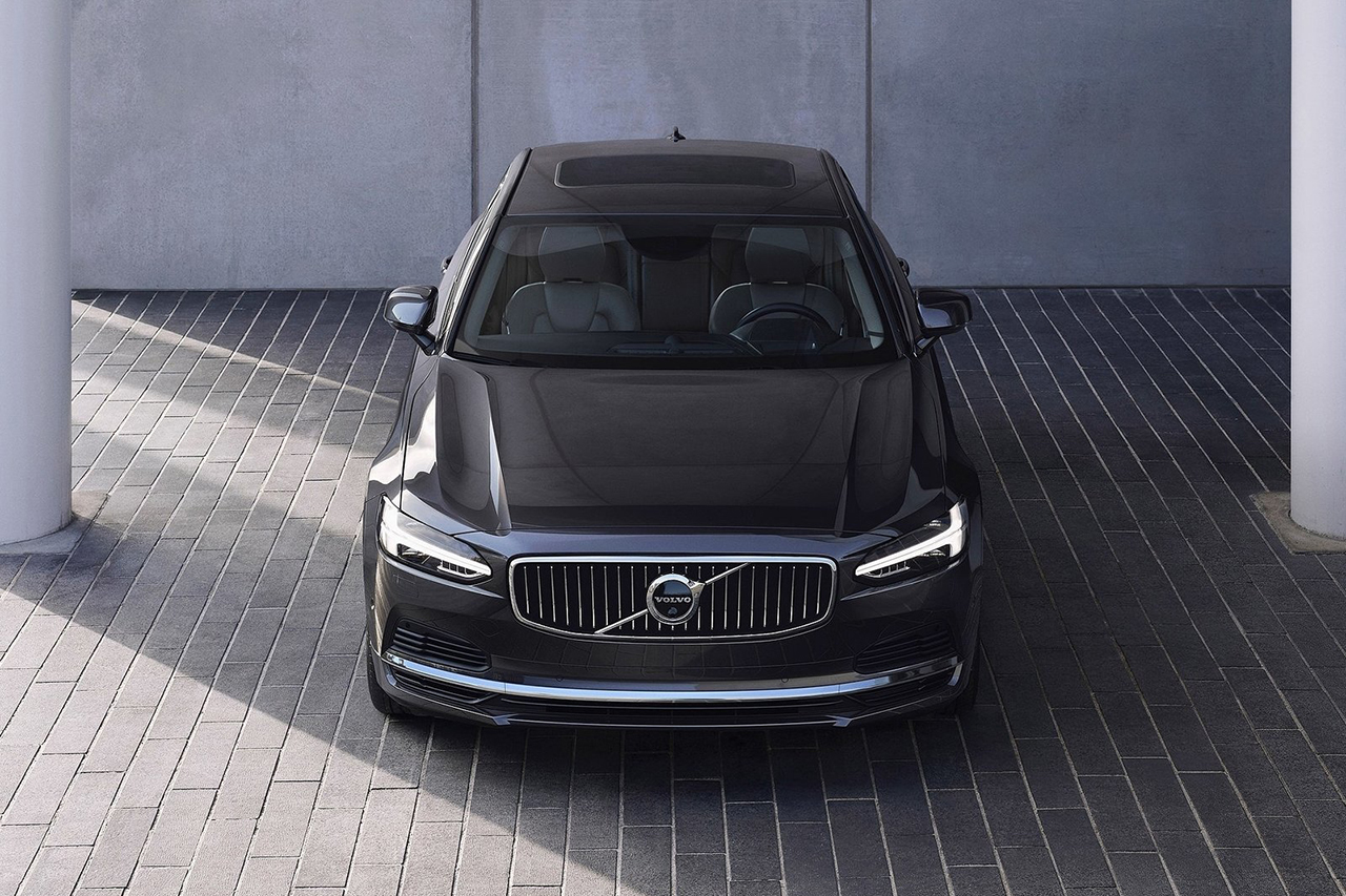볼보 S90 플러그인하이브리드는 날렵한 헤드라이트와 세련된 라인이 돋보입니다. 은은한 크롬 디테일이 고급스러움을 더합니다.