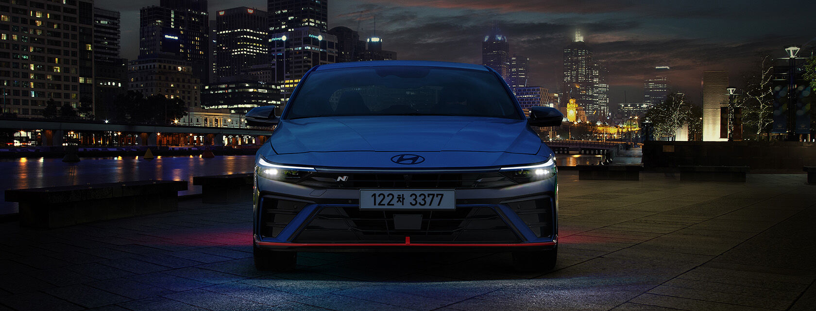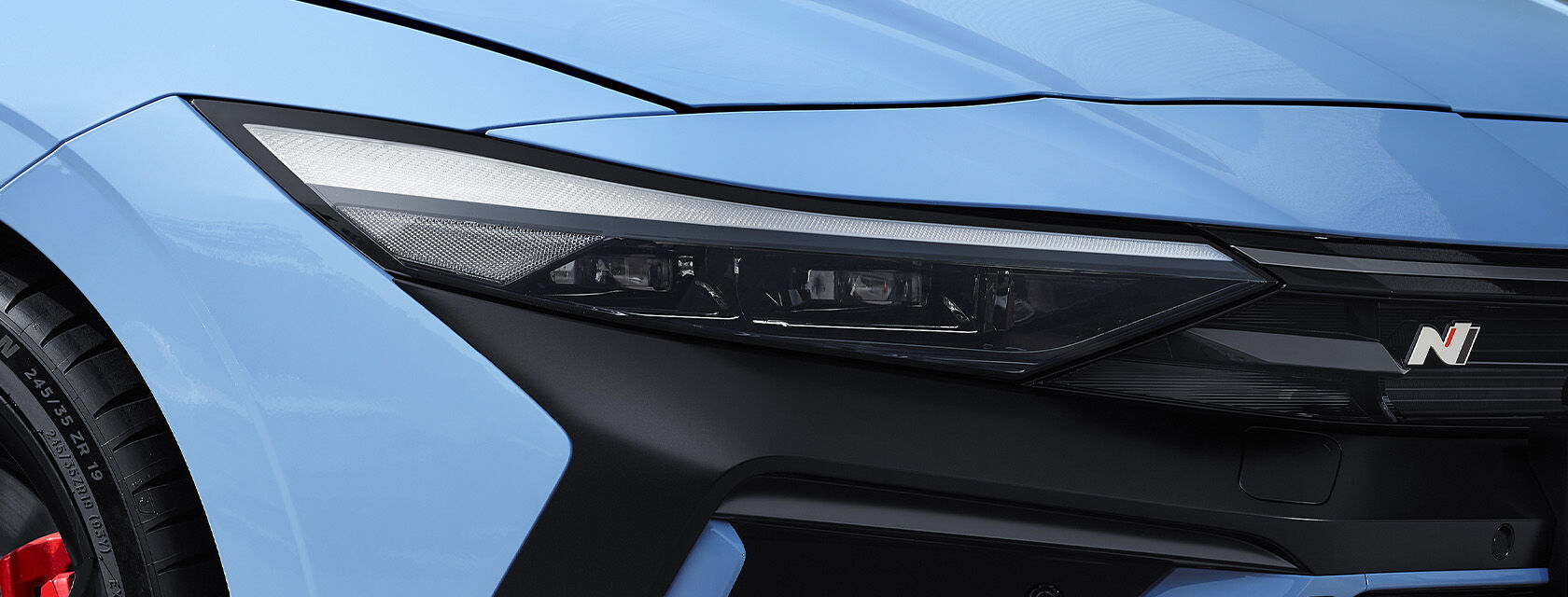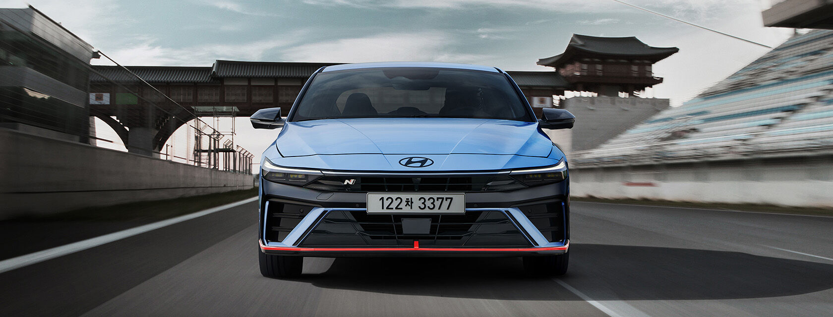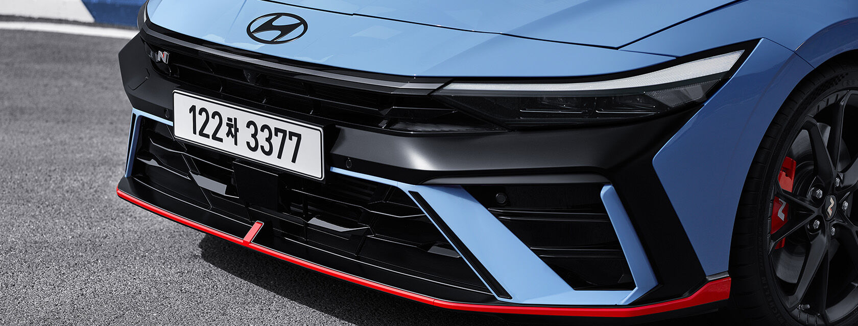 더 뉴 아반떼 N은 현대적이면서도 스포티한 디자인이 특징입니다. 날렵한 라인과 공격적인 전면부가 스포츠카의 느낌을 강조합니다.