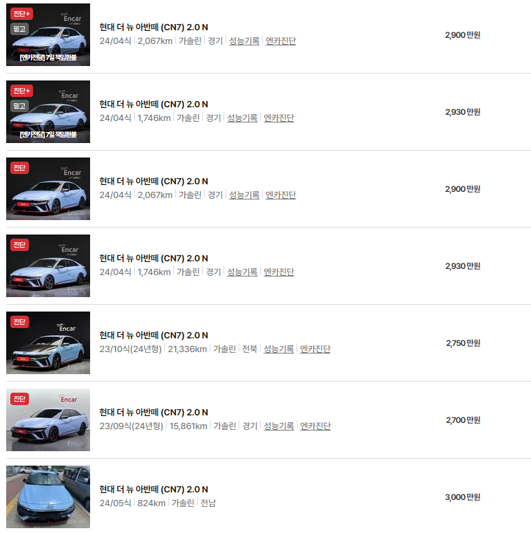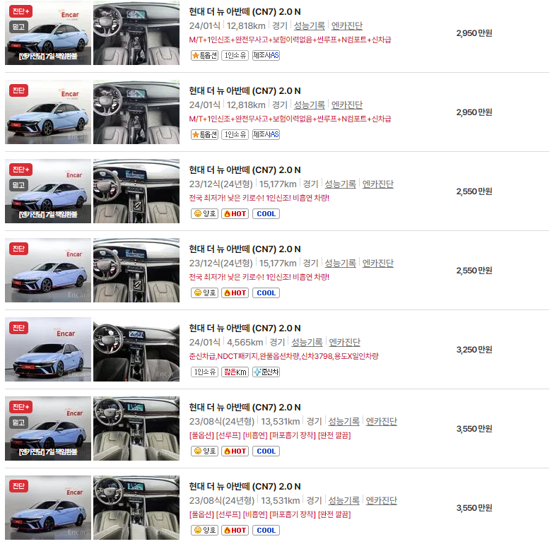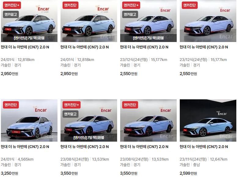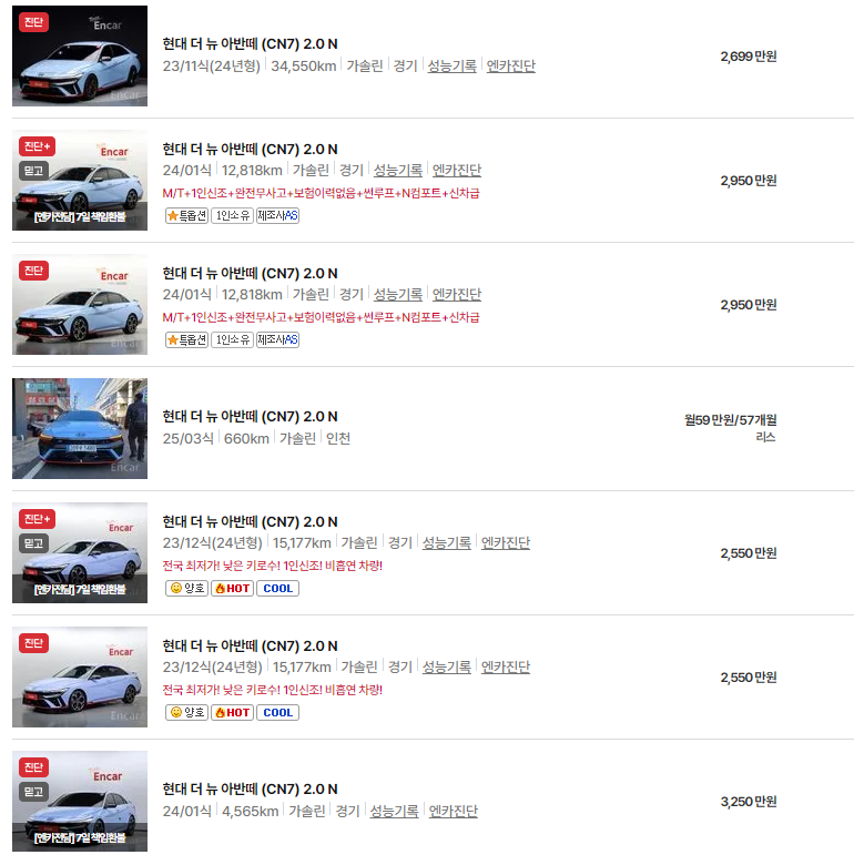 중고차는 글로 보기보다 직접 거래 사이트에서 확인하는 것이 정확합니다. 다양한 플랫폼에서 현대 더 뉴 아반떼 N 중고차의 실제 매물들을 비교해 보세요.