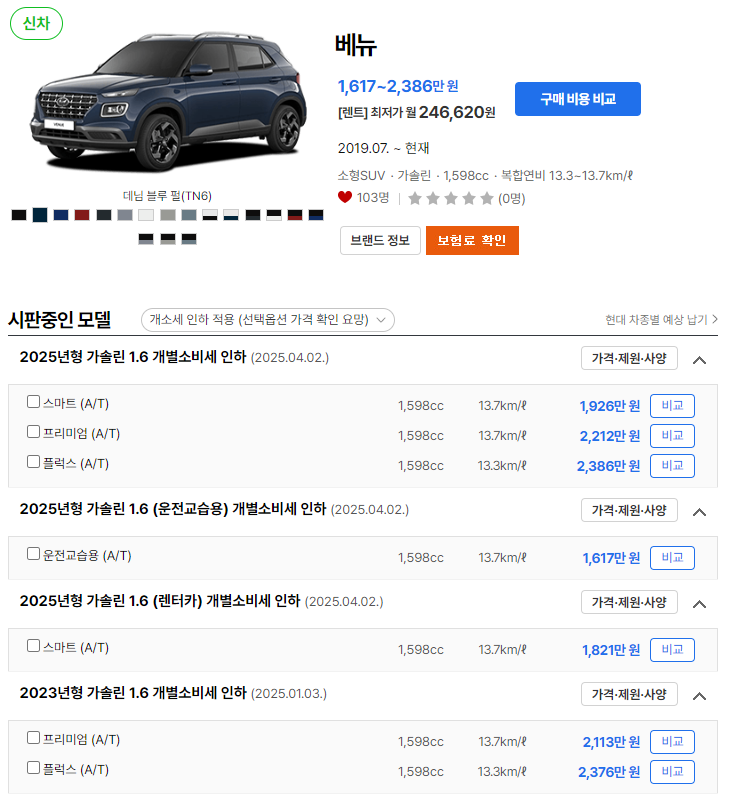 2025 베뉴 외에도 현대차의 투싼, 코나와 같은 모델이 인기를 끌고 있습니다.
