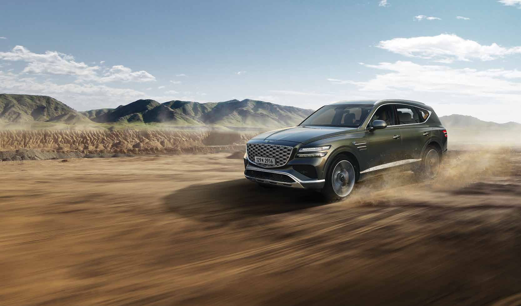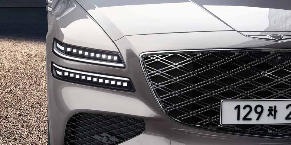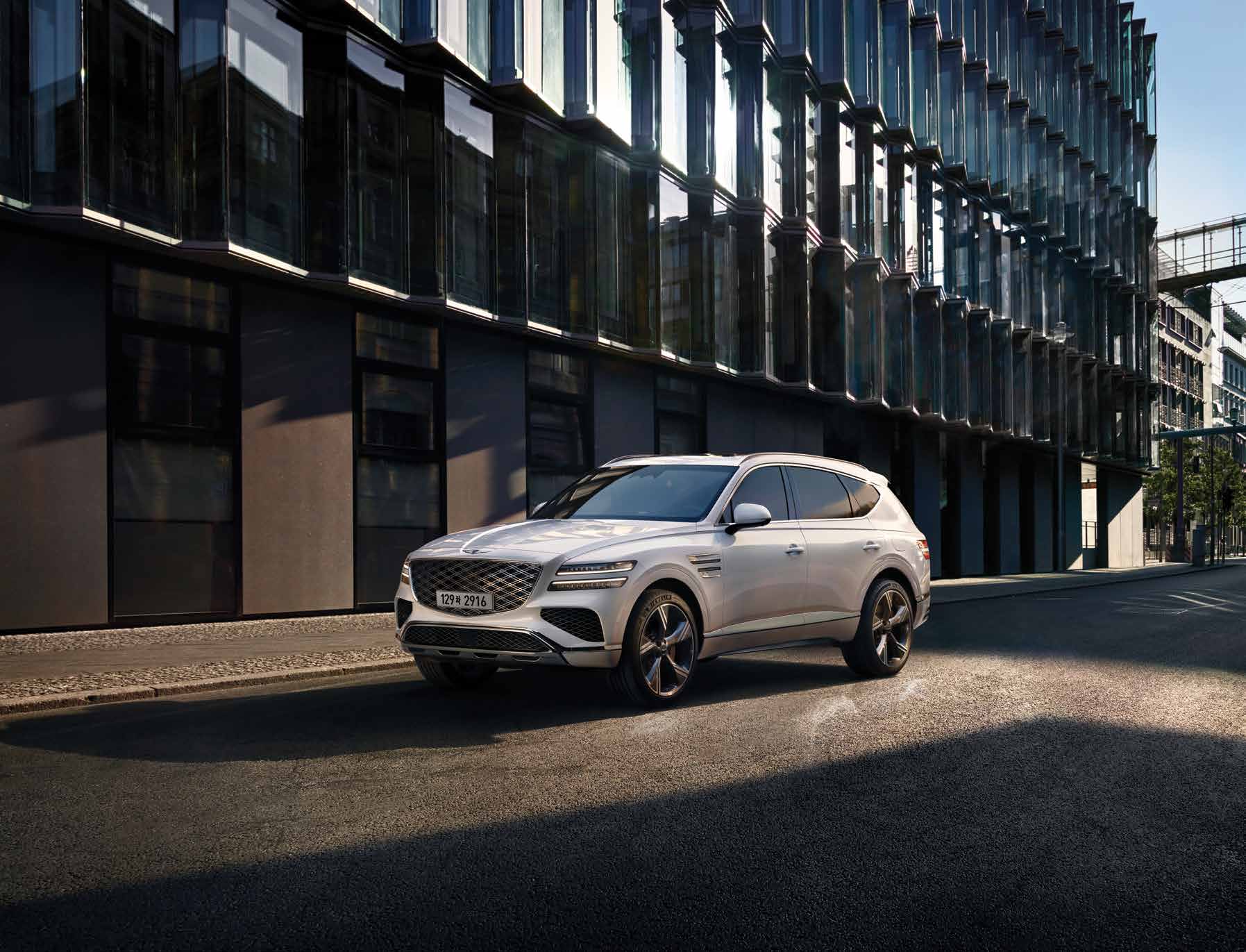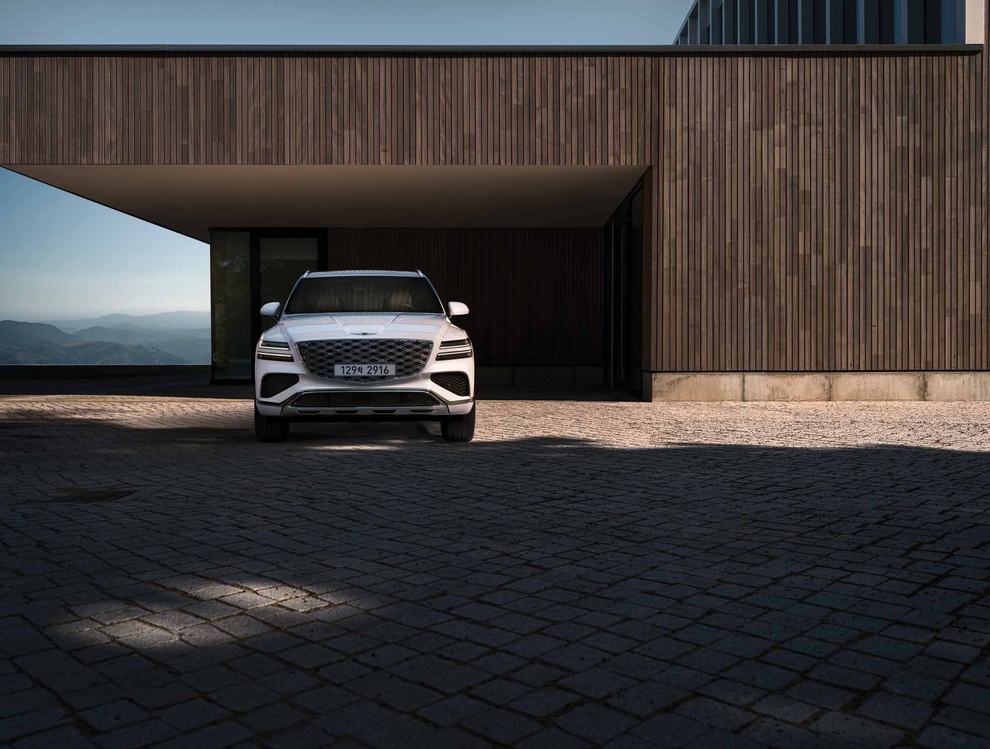 GV80은 눈에 띄는 세련된 디자인으로, 대담한 전면 그릴과 현대적인 LED 헤드라이트가 특징입니다. 직선적인 실루엣과 매끄러운 외관은 도로에서 주목받기 충분합니다.