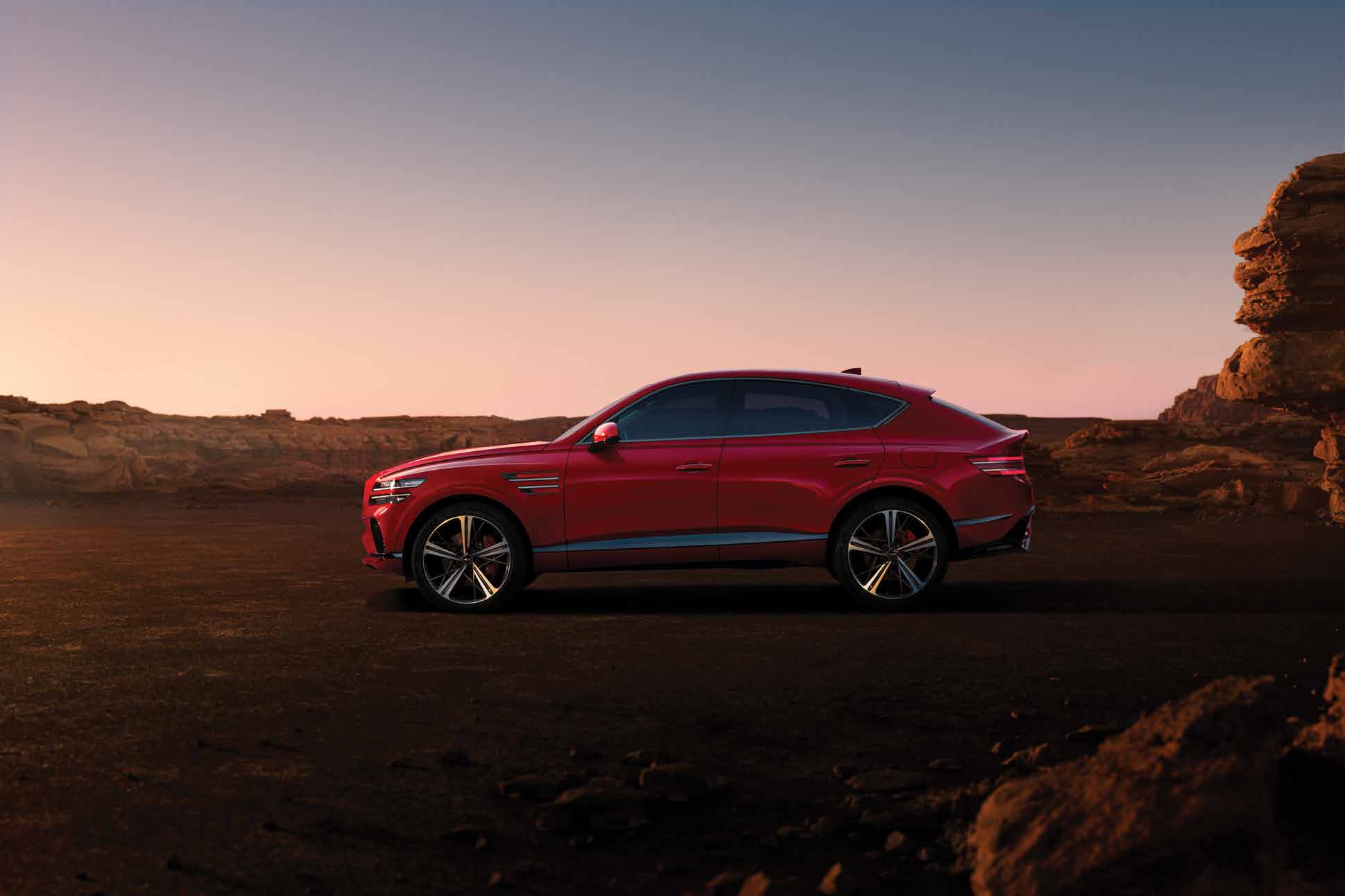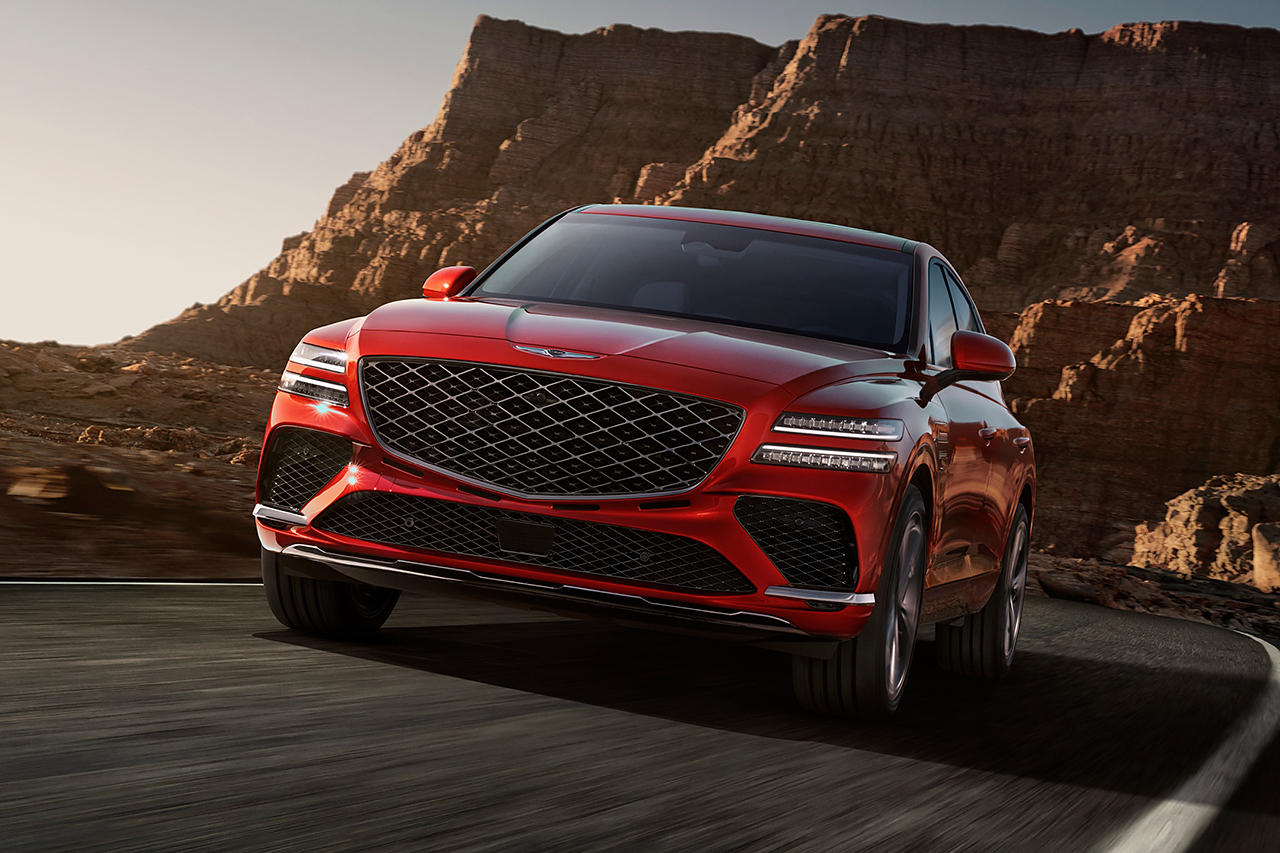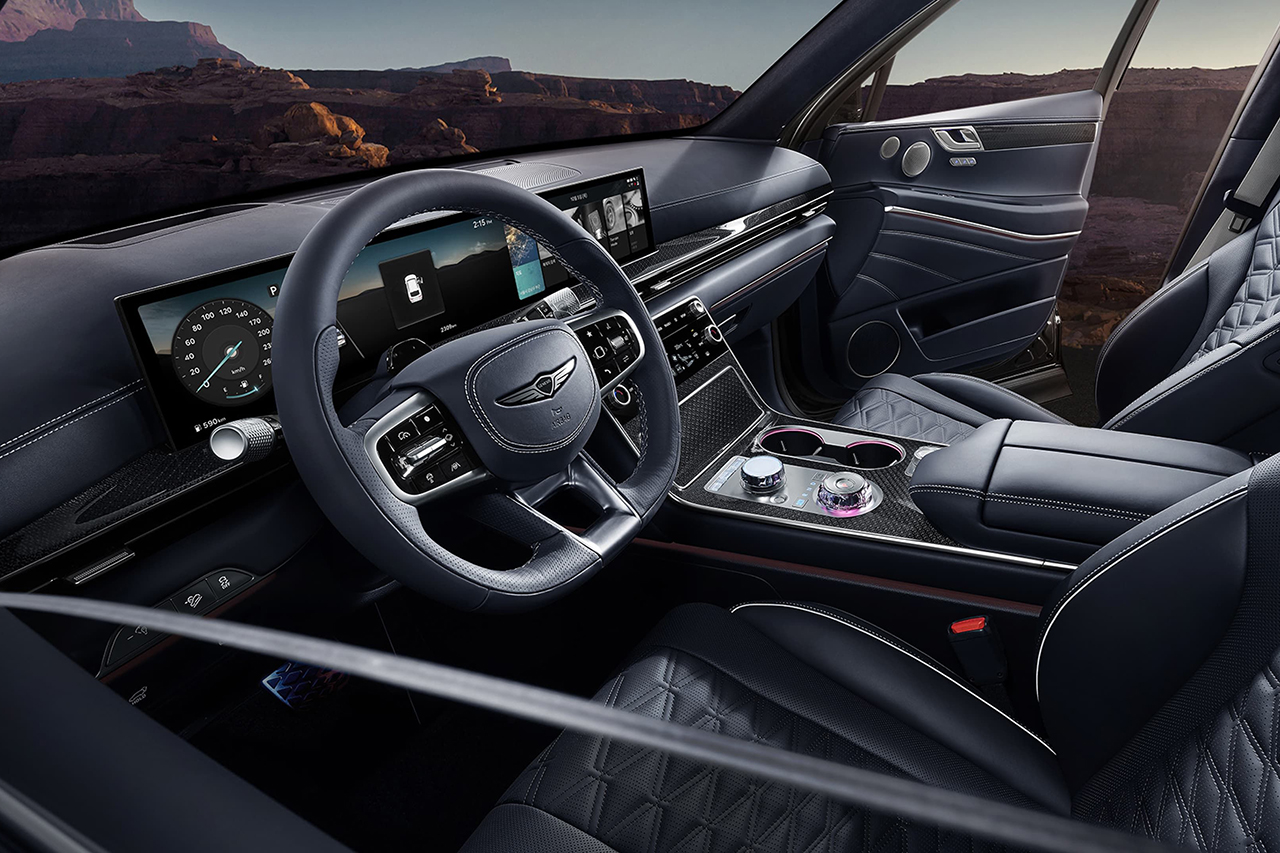 GV80은 눈에 띄는 세련된 디자인으로, 대담한 전면 그릴과 현대적인 LED 헤드라이트가 특징입니다. 직선적인 실루엣과 매끄러운 외관은 도로에서 주목받기 충분합니다.