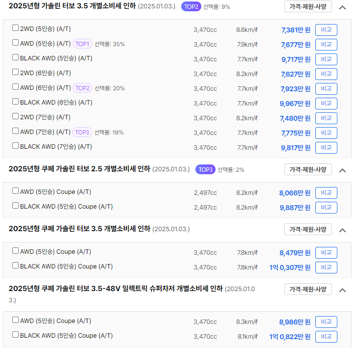 | 2WD (5인승) | 6,945만 원 | 가솔린 2.5 터보 | 9.3㎞/ℓ |