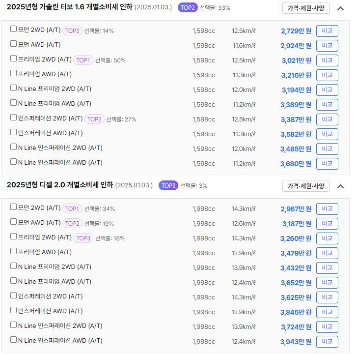 - N Line 프리미엄 4WD (A/T): 3,847만 원 (14.3㎞/ℓ)