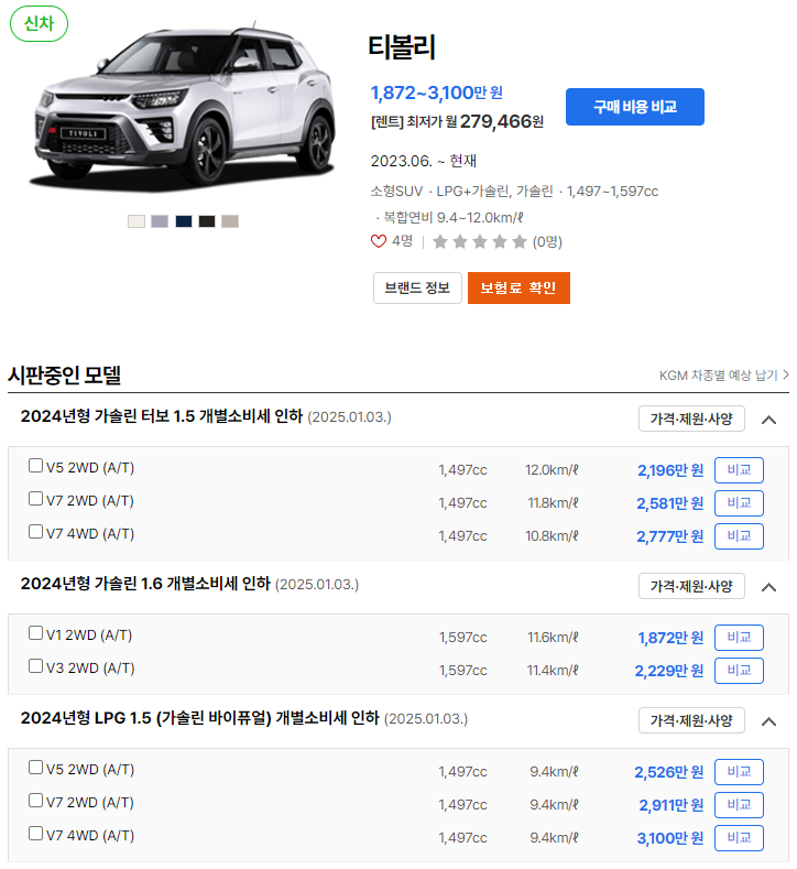 2025 티볼리 에어 렌트/리스 가격