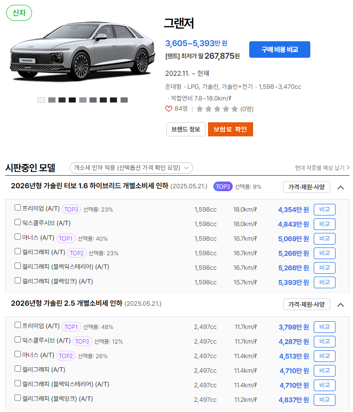 2026 그랜저의 가격은 트림 및 옵션에 따라 다양하게 구성되어 있습니다.
