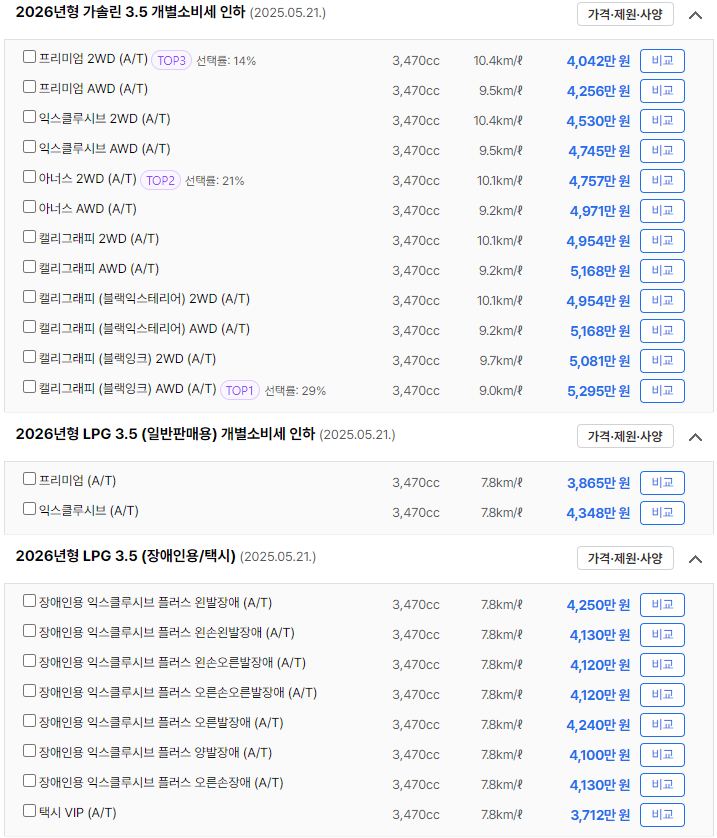 가격은 선택한 트림, 옵션, 개별 소비세 인하 혜택 등 다양한 조건에 따라 변동됩니다. 옵션 구성과 가격대를 비교해보면 나에게 맞는 트림을 찾기 쉬워집니다.