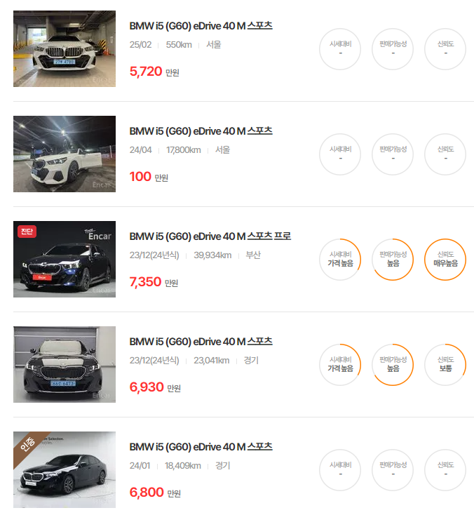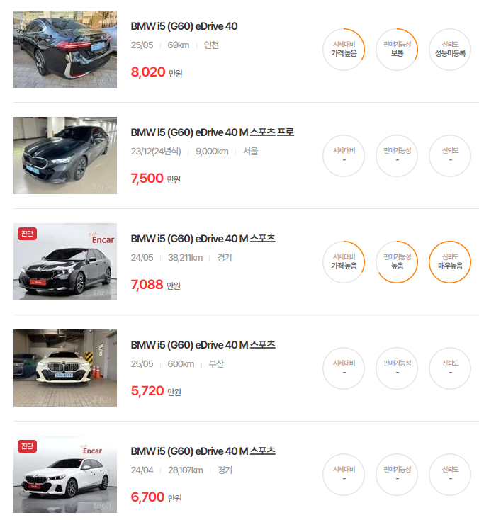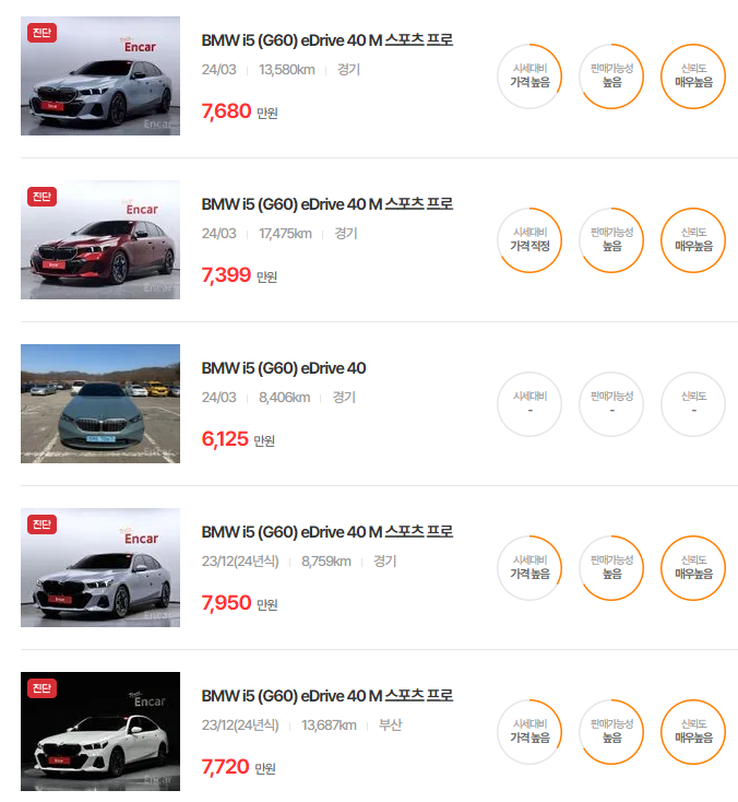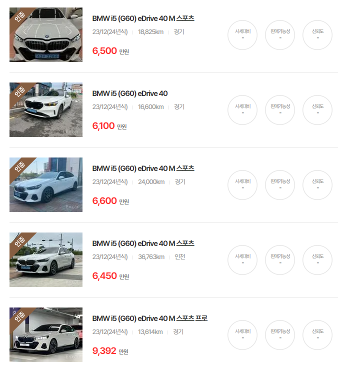- 2024년식 BMW i5는 최신 사양을 자랑하며, 주행거리나 옵션에 따라서도 가격 차이가 존재합니다. 인기 연식으로 많은 소비자들이 찾고 있습니다.